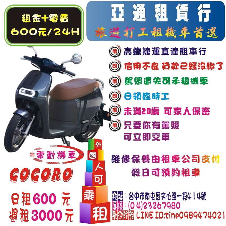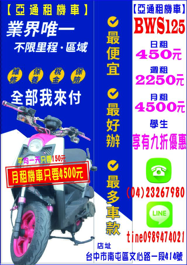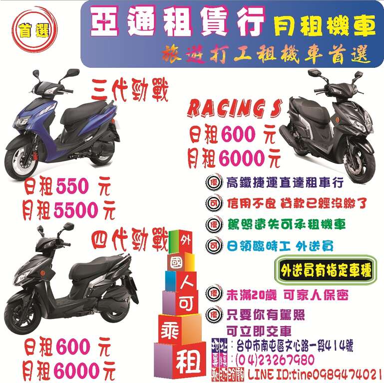 高铁捷运水安宫站 步行4分钟 直达到亚通 本公司因端见租赁;然已成为未来社会的主流趋势,遂於2008年延聘相关专业领域人士, 致力研究开发出有别於过去且更适合顾客需求及市场导向的商品与经营模式,现已成为业 界颇具营运规模及完善服务的机车租赁公司。监於多年来与本公司配合的顾客数和企业行号数量与日俱增,为了更能贴近客户,聆听客户的声音,更精心设计研发出为客户专属量身打造之个人规划租赁专案,今後将持续秉持专业服务与一贯专注、创新、热忱、负责的经营态度,以成为机车租赁服务业第一品牌为自我期许。