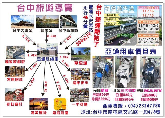 <p>台中捷运水安宫站-步行4分钟即可抵达亚通喔 </p> <p>本公司因端见租赁儼然已成为未来社会的主流趋势,遂於2008年延聘相关专业领域人士, 致力研究开发出有别於过去且更适合顾客需求及市场导向的商品与经营模式,现已成为业 界颇具营运规模及完善服务的机车租赁公司。监於多年来与本公司配合的顾客数和企业行号数量与日俱增,为了更能贴近客户,聆听客户的声音,更精心设计研发出为客户专属量身打造之个人规划租赁专案,今後将持续秉持专业服务与一贯专注、创新、热忱、负责的经营态度,以成为机车租赁服务业第一品牌为自我期许。 随着社会发展及生活水准的提高,观光产业与科技产业共同被视为是21世纪之明星产业,人们较以往更重视如何在紧凑的生活步调之余,提升生活品质以及休闲育乐的调剂,因此无烟囱工业始得蓬勃发展,展现了观光休闲业的魅力。而如何提升优质的观光品质,提供便利的机车交通运输服务,即是我们汲汲营营、努力服务大众的目标。 诚信:我们应以绝不妥协的诚实与正直之态度,来从事任何事情。 服务:秉持以客为尊的精神,依客户的需求提供更加优质的服务。 人才:妥善规划学习成长蓝图,强化职涯发展实力,适才适所展望未来。 创新:聆听顾客声音,弹性调整经营策略,适应市场趋势及需求 </p>