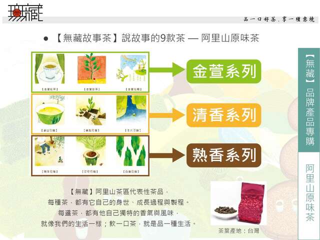 「好茶无藏、情意无藏、价格无藏」是无藏一直以来想传达的品牌思想。我们积极串联线上与线下的资源,提供给茶友们安全的茶叶原料、来源背景、品茶知识、稳定的价格、环保减量的包装,更甚至是每周三固定在无藏乌日体验店举办的茶叶分享会,都是无藏希望为台湾茶产业带来更好的交流。台湾茶拥有得天独厚的优势,除了地理及气候外;更富含悠久的历史与文化意义。在新旧时代的交替潮流中,为喜欢追求新鲜与价值感、注重生活品味的茶友们,努力着透过我们的茶,让您们找到对台湾茶的归属感。