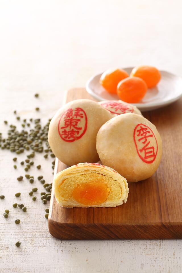 旧振南的绿豆椪采用严选中颗饱满绿豆,经过泡、洗、滤、蒸、压、煮、炒7道繁复手工程序,制成酥松绵密的清香绿豆沙馅,手杆的千层饼烘烤後层次分明、香气清新淡雅。