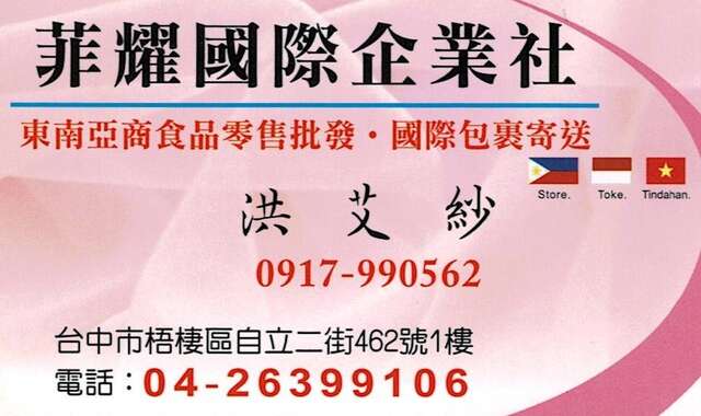 菲律宾商品、食品、化妆品、生活用品、酒类、饮料、二微型电动机车零售批发,是台中港区域梧栖道地,专业服务菲律宾人、及菲律宾船员之商店,来到这里可以感受到菲律宾家乡的食材及味道,欢迎大家来看看及购买。