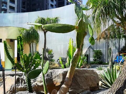 广场为下沉式设计,沉浸在充满大型沙漠植物及阔叶植物的空间里庇荫。