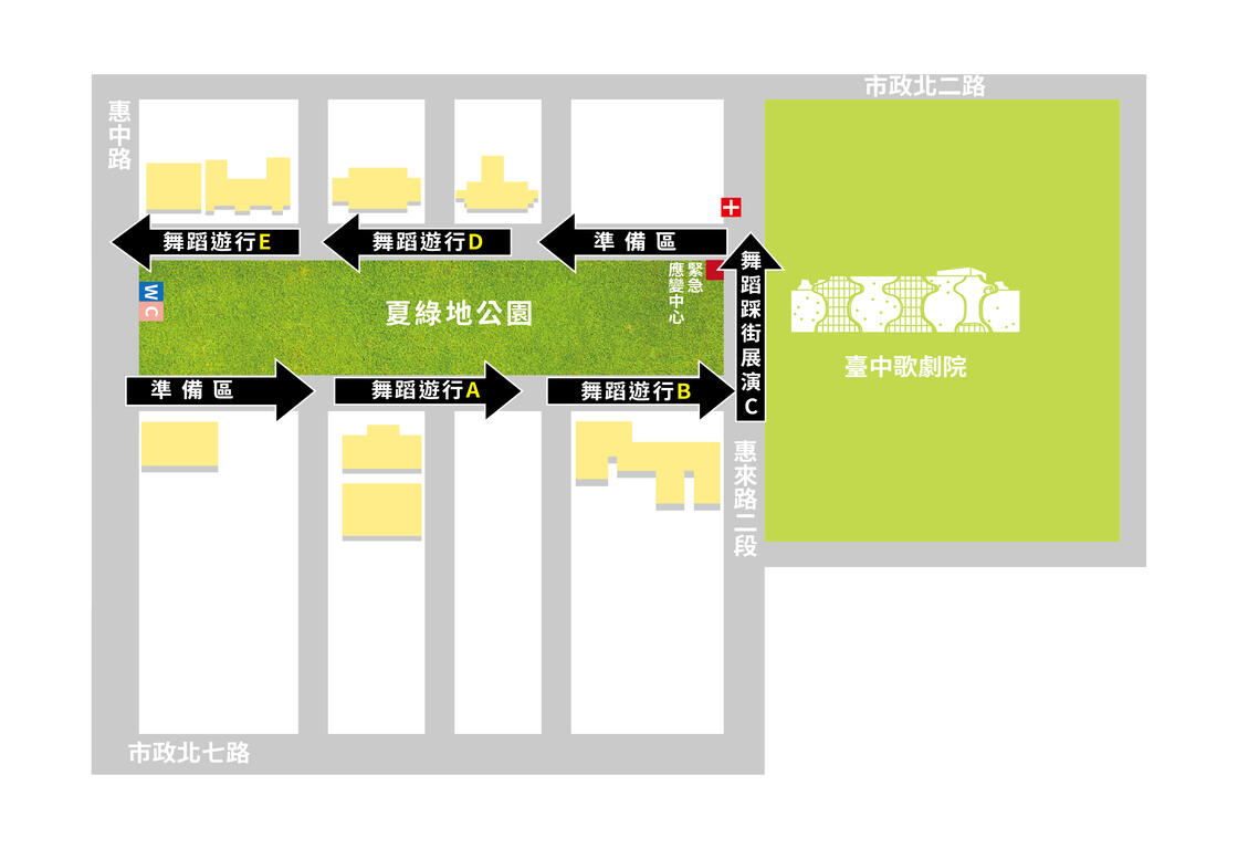 (一) 舞蹈踩街暨舞台競演活動【11月17日(五)至18日(六)舉行】:由全國大專院校及高中職、國中及在地舞蹈表演社團共12隊代表隊,另邀請日本安濃津YOSAKOI、名古屋真中祭、北海道YOSAKOI索朗祭代表團隊等共5隊國際隊擔任客隊,將舞蹈融入文化意象,以街道為舞台,為臺中帶來熱情與活力。