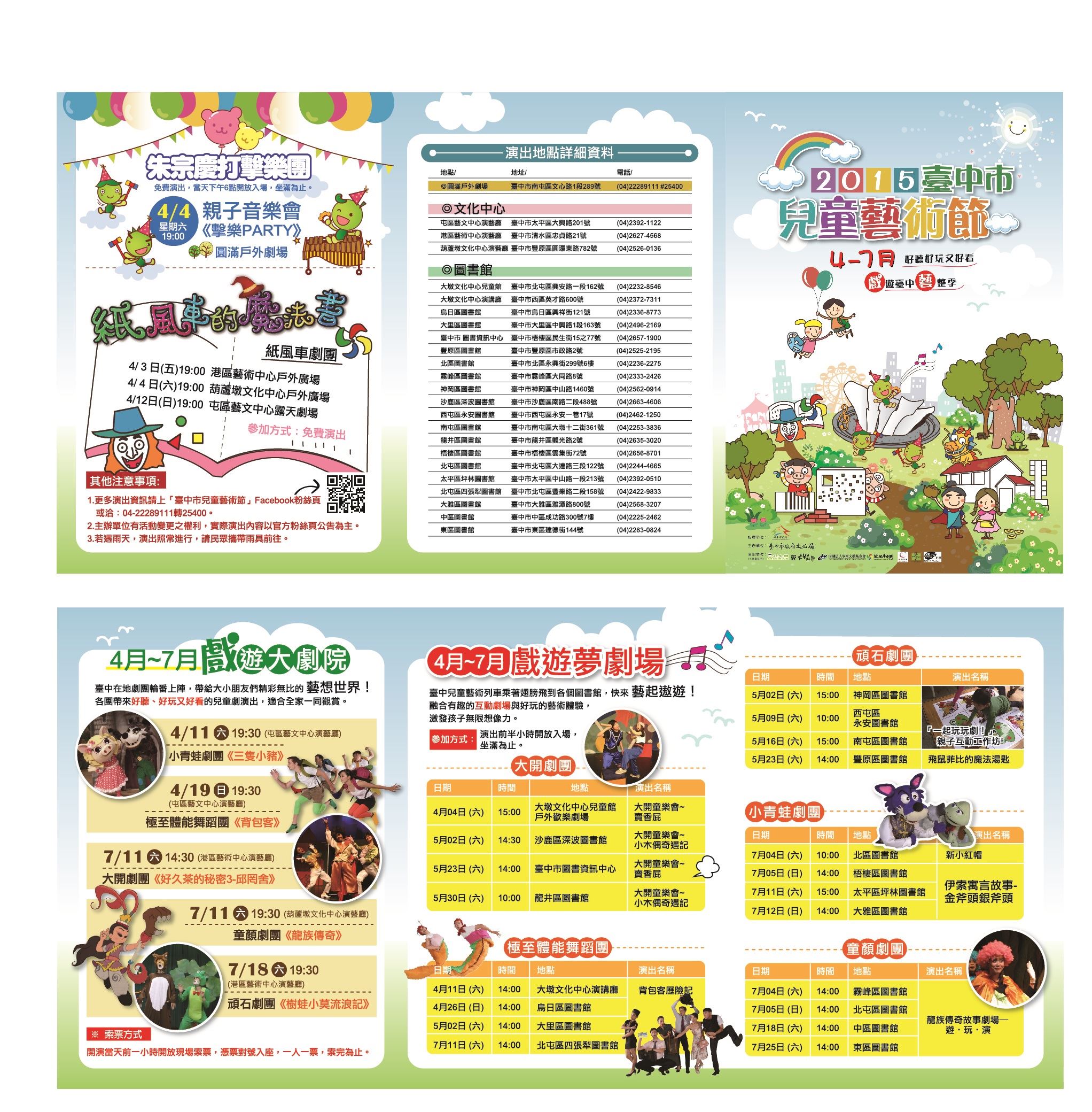 「2015臺中市兒童藝術節」4月3日起,將在圓滿戶外劇場、大墩文化中心、葫蘆墩文化中心、港區藝術中心、屯區藝文中心以及大里區圖書館、豐原區圖書館、北區圖書館等臺中市18個區圖書館場地陸續展開,邀請國內知名的演藝團隊,帶來精采演出、藝術體驗及故事劇場等各式各樣的節目,帶給所有的小朋友「戲遊臺中藝整季」。