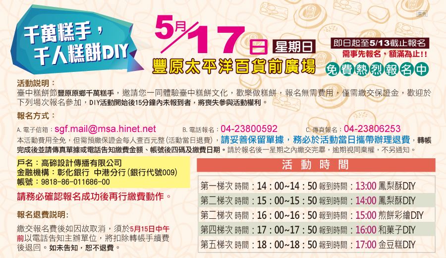 6月13日於草悟道活動當天現場攤商提供優惠價格,還將舉辦「糕餅測重大賽」,絕對讓您一嚐臺中幸福,絕讚糕餅美味。