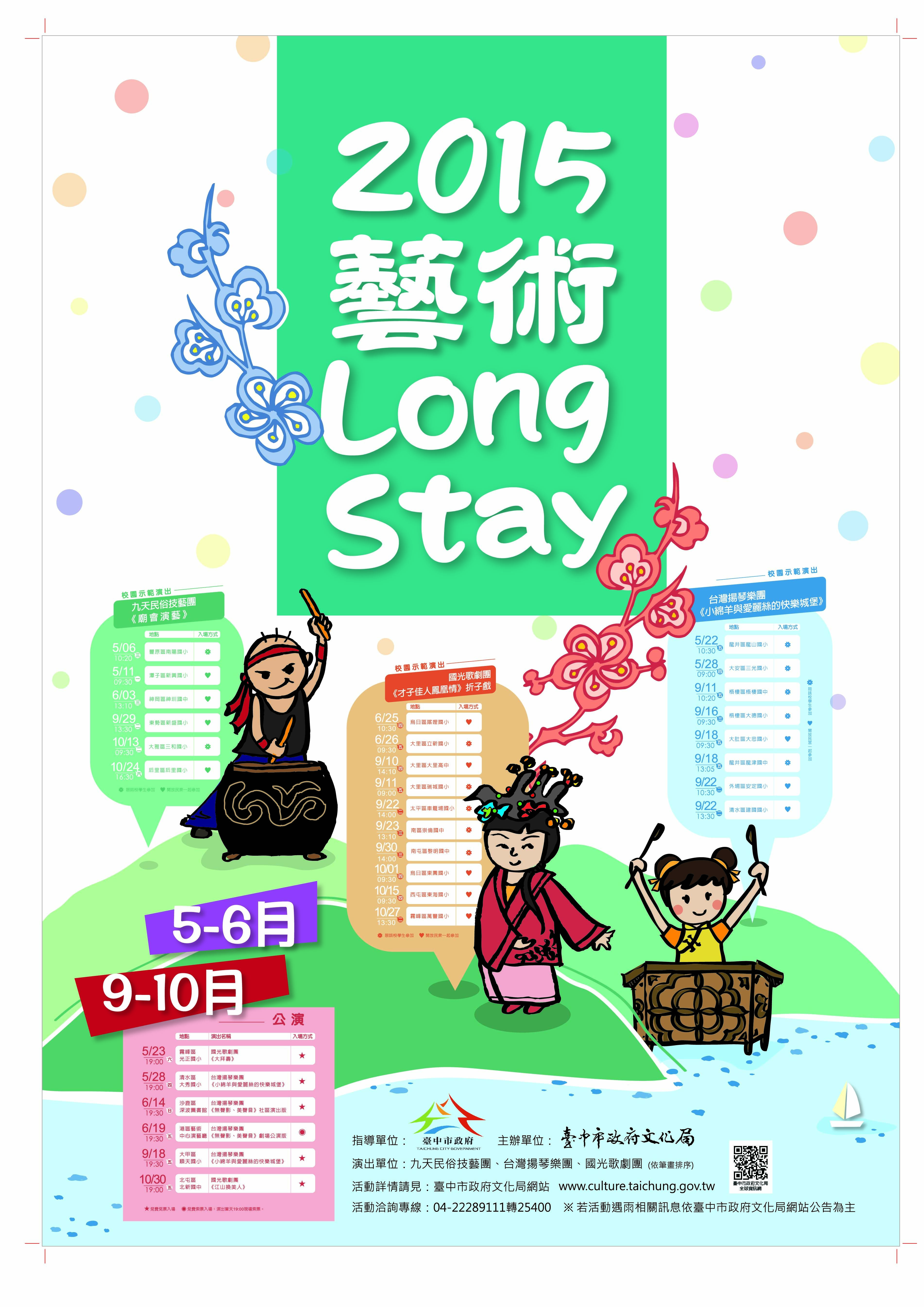 臺中市政府文化局為推動藝術教育扎根,持續辦理藝術Long Stay活動,邀請表演團隊到校園推廣演出, 5月1日在臺中市政府舉辦活動記者會,宣佈今年藝術Long Stay活動開跑,從5-6月、9-10月,邀請臺中在地優質表演團隊:九天民俗技藝團、台灣揚琴樂團及國光歌劇團,到本市學校、社區等場地舉辦30場推廣演出,以校園為主要藝術教育扎根基地,將藝術的種子散播到本市各地。