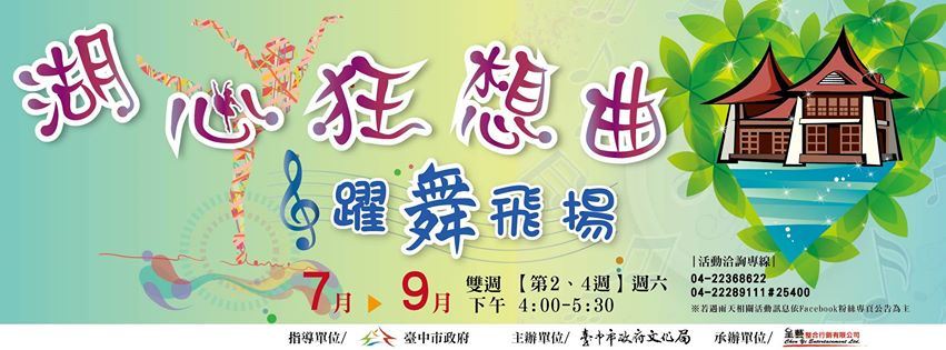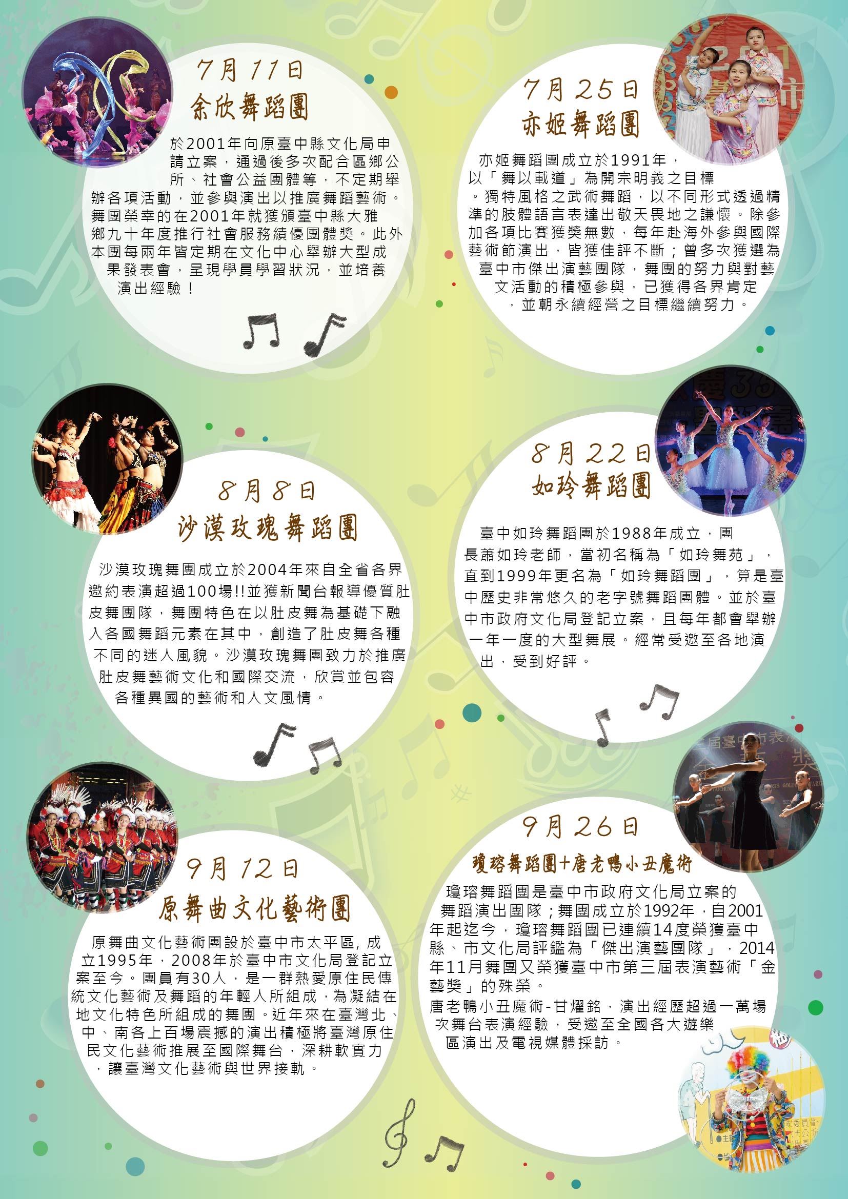 | 7月25日 | 亦姬舞蹈團 | 亦姬舞蹈團成立於1991年,以「舞以載道」為開宗明義之目標。獨特風格之武術舞蹈推廣,以不同形式透過精準的肢體語言表達出敬天畏地之謙懷。除參加各項比賽獲獎無數,每年赴海外參與國際藝術節演出,皆獲佳評不斷;曾多次獲選為臺中市傑出演藝團隊,舞團的努力與對藝文活動的積極參與,已獲得各界肯定,並朝永續經營之目標繼續努力。 |