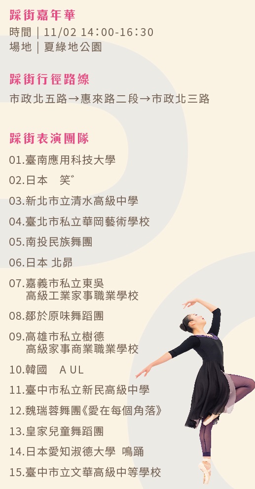 *於舞蹈踩街展演期間,在夏綠地公園周邊進行交通管制,敬請用路人注意並提前改道,造成不便,敬請見諒。
