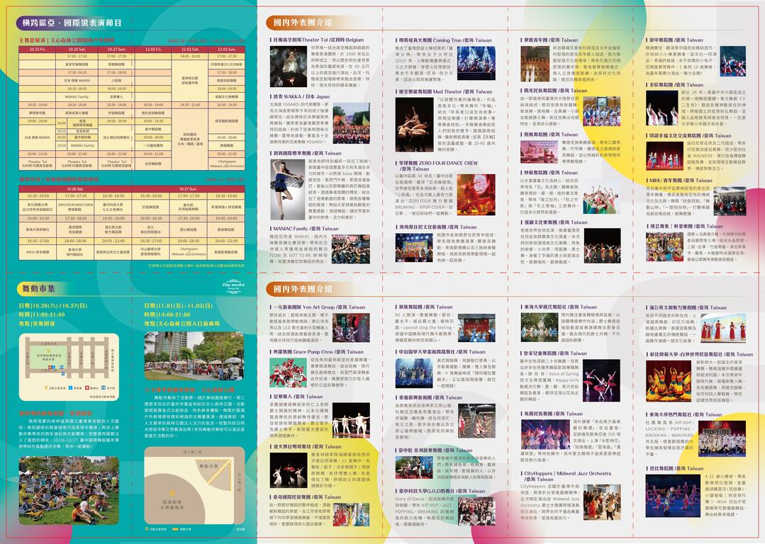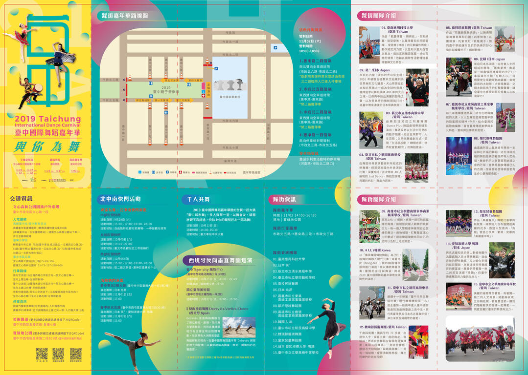 「2019臺中國際舞蹈嘉年華」藉由表演藝術與舞蹈運動推廣觀光之主軸,邀請國際知名舞蹈團體來臺進行表演交流,同時促進活動在地化與本土化,在樂曲中融入傳統節慶文化或歷史故事作為表演背景,展現本土特色。