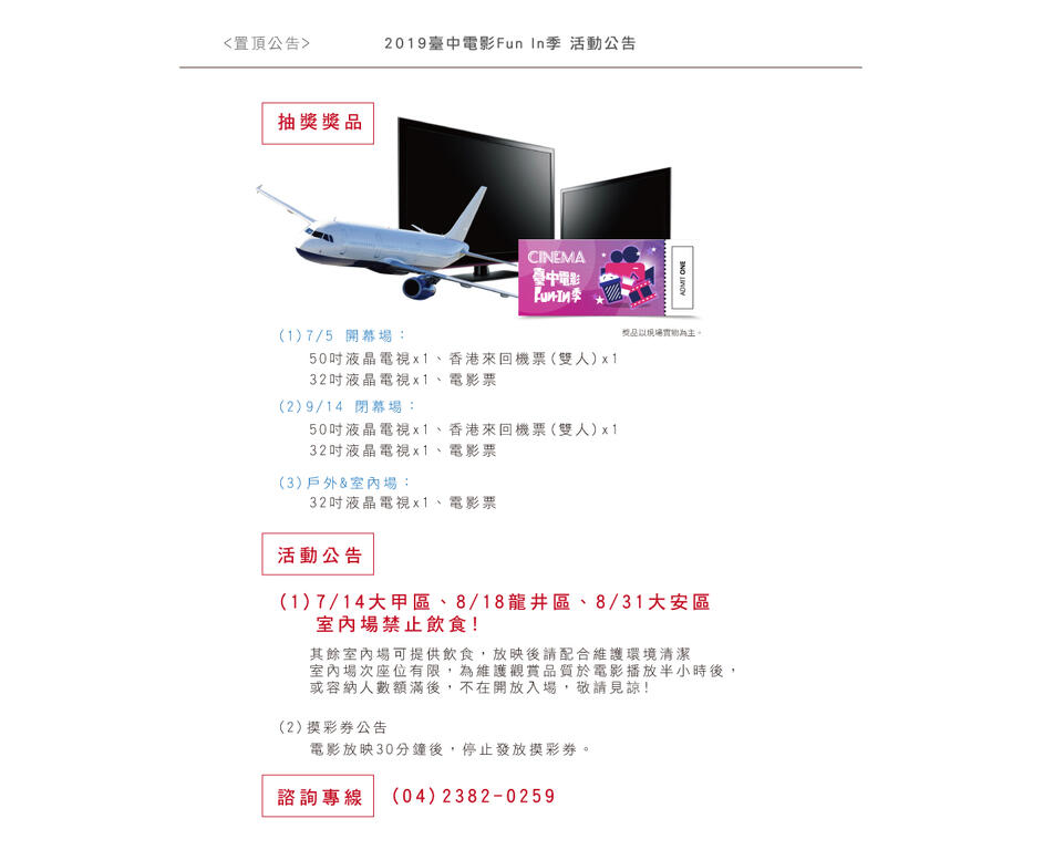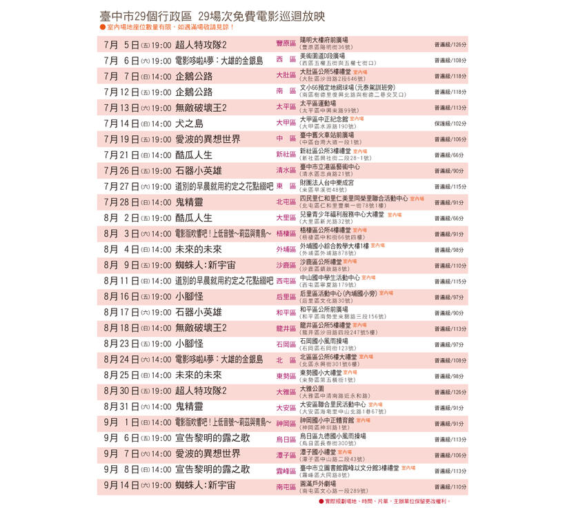 活動月份:2019-07-05~2019-09-14 加入Google行事曆 台中電影fun in季今天開跑囉囉!29個行政區巡迴放映! 活動內容臺中電影Funin季經過幾年的深耕,已經成為臺中市民暑假期間所期待的活動之一,主要首選國際熱門的動畫影片,使放映活動更具有可看性和國際性,以便接軌之後的國際動畫影展及義大利經典影展,並讓市民可以在周末假日與全家人一起走出戶外,體驗夏日蚊子電影院的氛圍,增進親子關係。 2019臺中電影放映季-動畫節目預告影片 相關照片