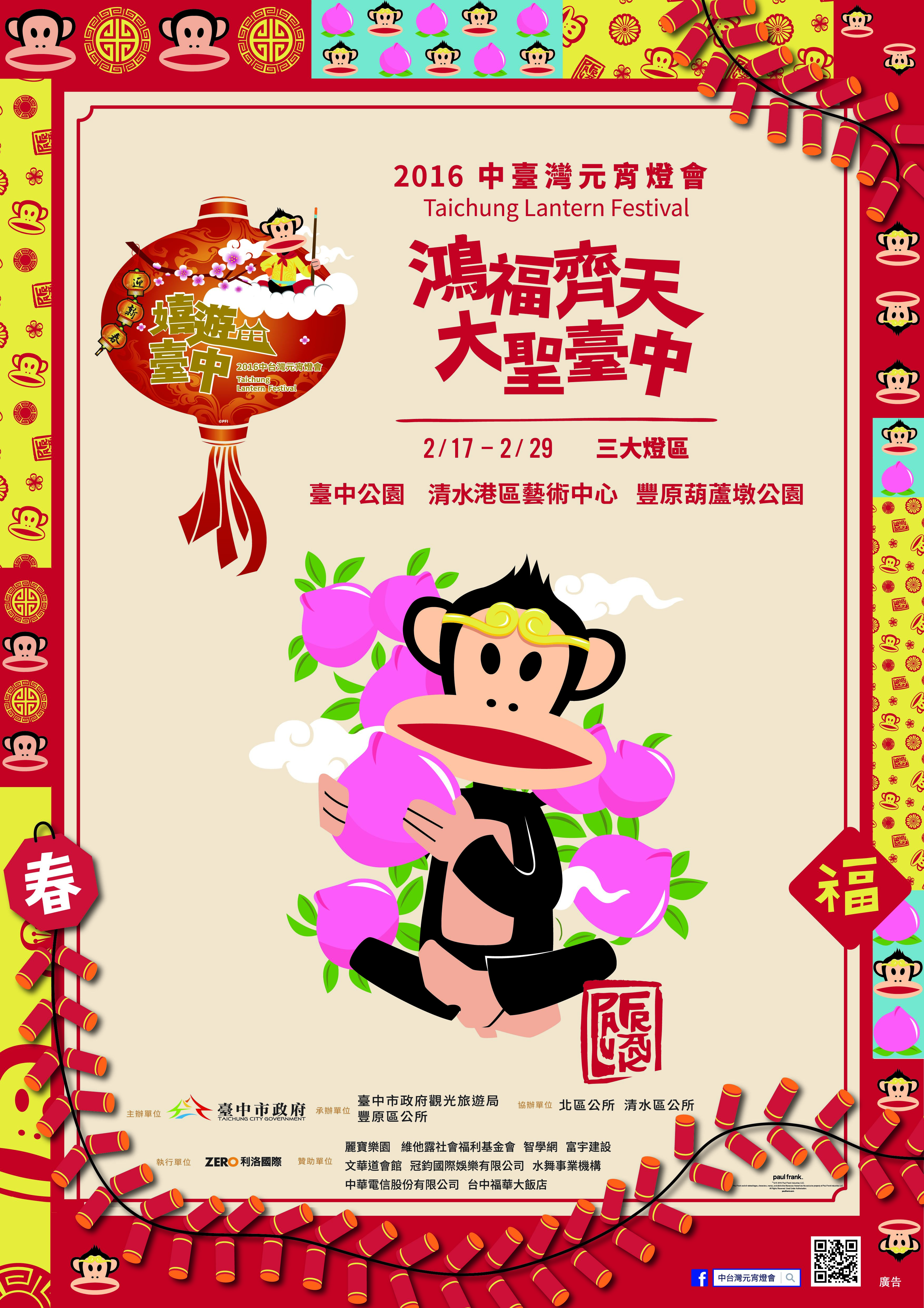 2016中臺灣元宵燈會將於2月17日至2月29日於臺中公園、清水港區藝術中心、豐原葫蘆墩公園三大燈區閃亮登場,展開為期13天的燈節藝術饗宴。2月17日下午7時由豐原燈區率先開燈,同日下午8時30分清水燈區開燈,18日下午7時則是壓軸的臺中公園開燈,燈會活動一直延續至228連續假期,三地同步營造浪漫美麗燈海,釋放繽紛,營造歡樂與傳統節慶熱鬧氣氛,展現臺中市年輕、樂活有活力之城市形象