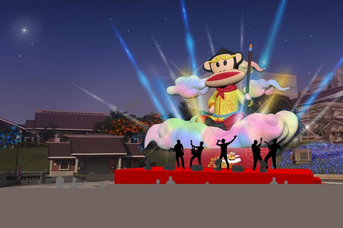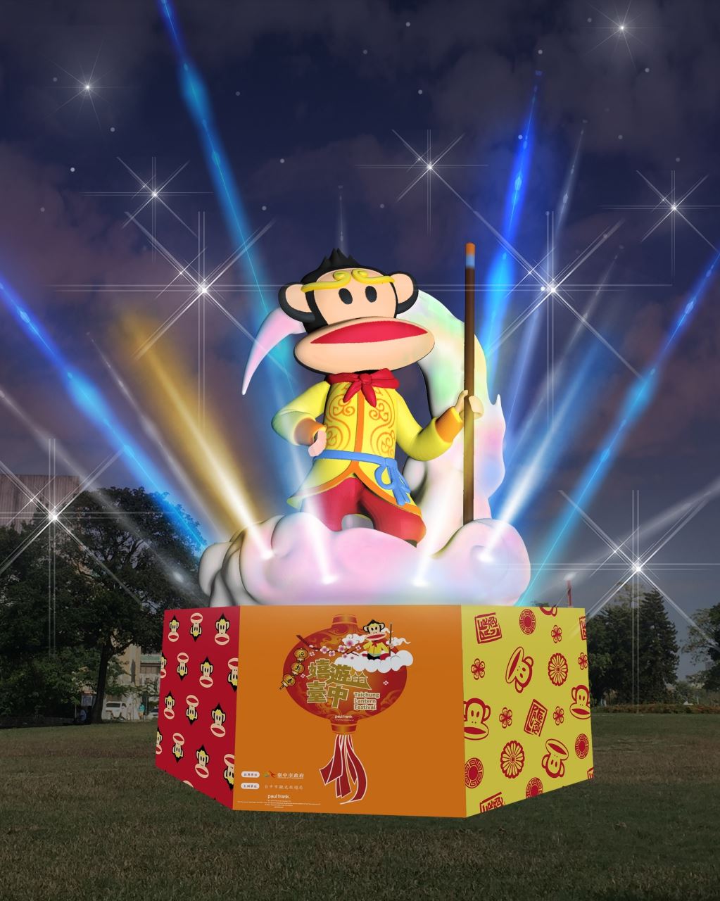 - 臺中公園主燈以大嘴猴化身為西遊記的主角齊天大聖,命名為「鴻福齊天‧大聖臺中」,以腳踩筋斗雲的雄偉姿態來呈現,代表「立足臺中‧放眼國際」,搭配360度的旋轉及七彩繽紛的燈光特效,帶給民眾不一樣的元宵燈會。