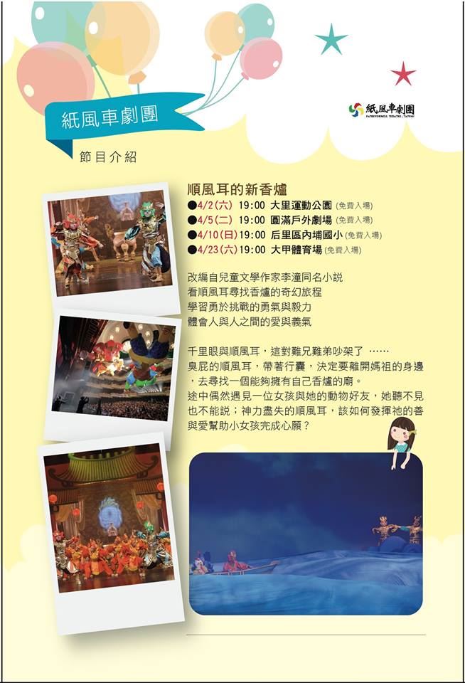 今年臺中兒童藝術節演出陣容匯集各界菁英演藝團隊,包括:國內引領兒童戲劇戶外演出的翹楚─紙風車劇團,將帶來最新的 年度創作大戲,改編自知名兒童文學著作《順風耳的新香爐》,將在4月期間分別到大里運動公園、圓滿戶外劇場、后里內埔國小以及大甲體育場,規劃國家劇院規模的大型演出下鄉,不僅讓在地人就近觀賞精緻、劇院規格的舞臺劇,藉著劇中人物的遭遇, 一同感受戲劇表演的創造力與想像力,學習面對挫折的勇氣。