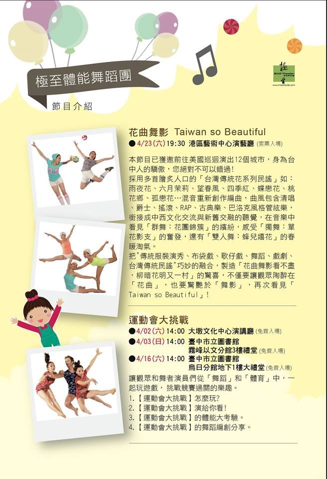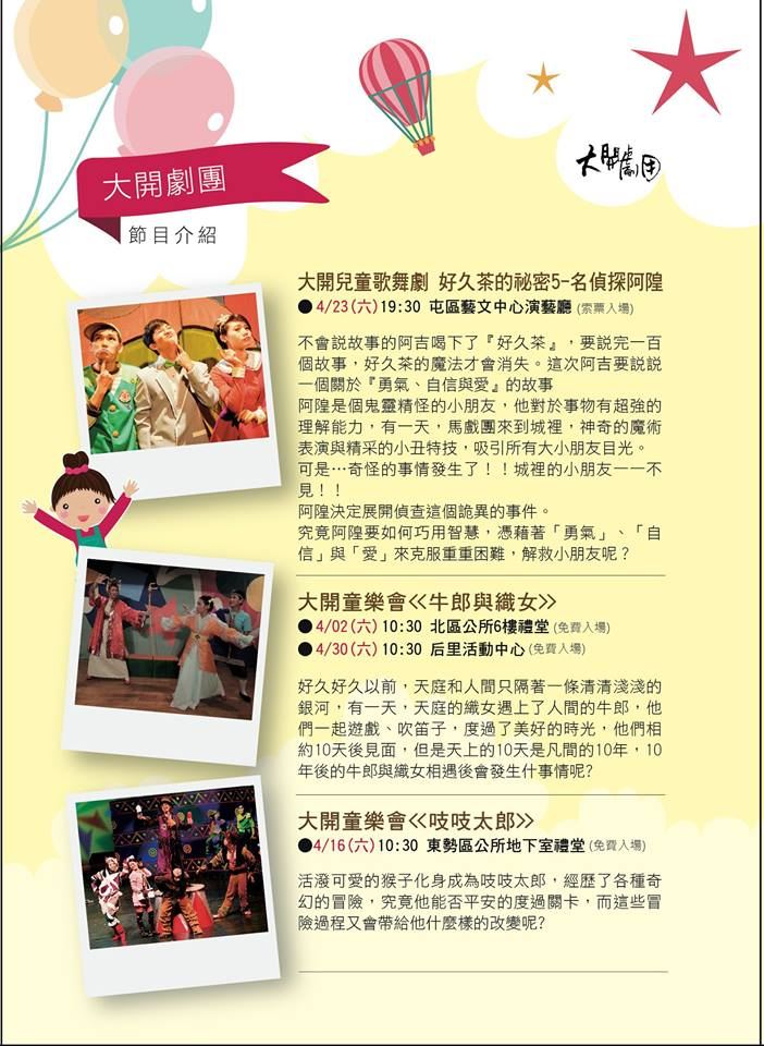 2016臺中市兒童藝術節自4月2日起陸續展開,活動完全免費,歡迎所有民眾大手牽小手,一起看表演,詳情請上臉書搜尋「臺中兒童藝術節」粉絲頁或上臺中市政府文化局網站。