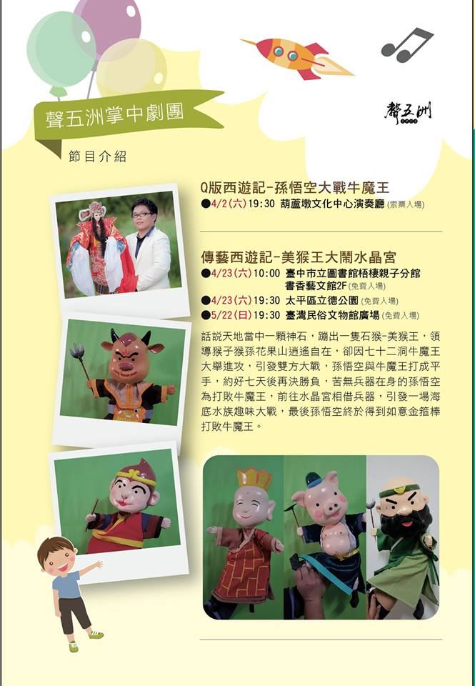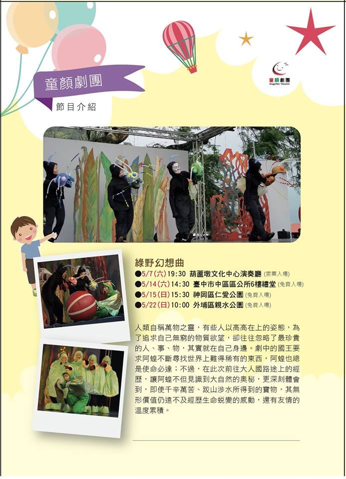 「2016臺中兒童藝術節」邀請日本的動物樂團、文化部品牌團隊紙風車劇團、本市優秀團隊大開劇團、小青蛙劇團、頑石劇團、童顏劇團、極至體能舞蹈團與聲五洲掌中劇團帶來好看、充滿藝術性又富教育意義的節目,自本(105)年4月2日至5月22日,於本市辦理大型兒童劇、演藝廳演出及社區巡迴等共計29場免費演出,保證精采可期。