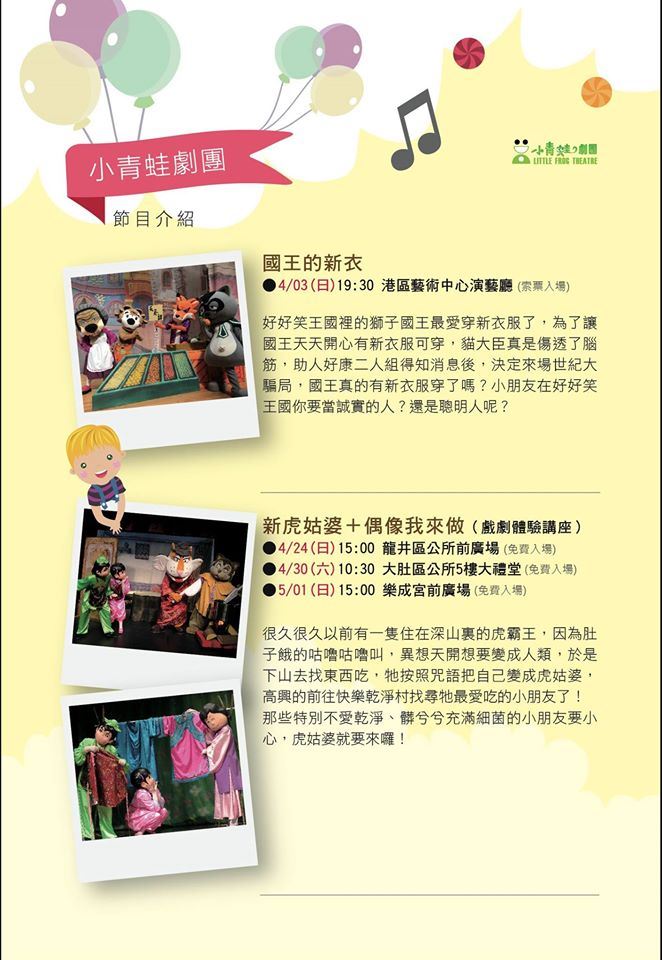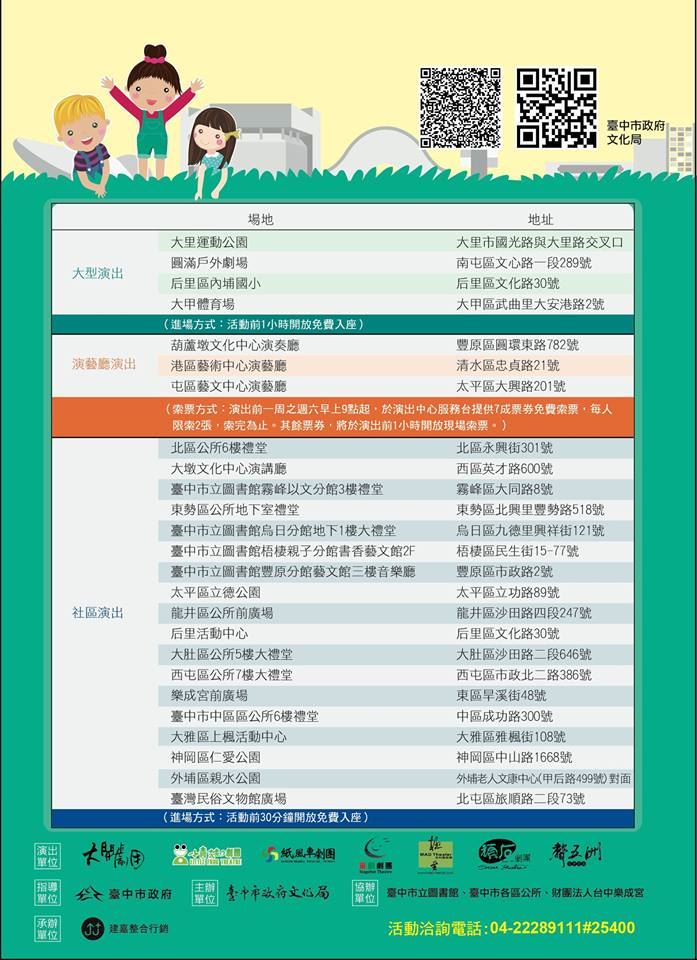 至於本市知名演藝團隊也不會在兒童藝術節缺席,包括大開劇團、小青蛙劇團、頑石劇團、童顏劇團、極至體能舞蹈團及聲五洲掌中劇團,將帶著精心製作的劇碼,在港區、屯區及葫蘆墩等中心演藝廳登場,演出劇碼不但精采有趣,又富含教育意義。同時為了培養民眾進入演藝廳觀賞演出的環境,演出將採免費索票方式。另外團隊也將帶著包括戲劇、舞蹈及傳統藝術等各種類型的精采演出,前往中區、東勢、外埔、神岡等社區場地,歡迎民眾踴躍參加。