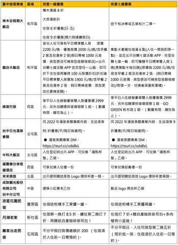 更多臺中市觀光旅館、旅館、民宿優惠,請至臺灣旅宿網臺中市專區(https://reurl.cc/Lmxxae)查閱洽詢。