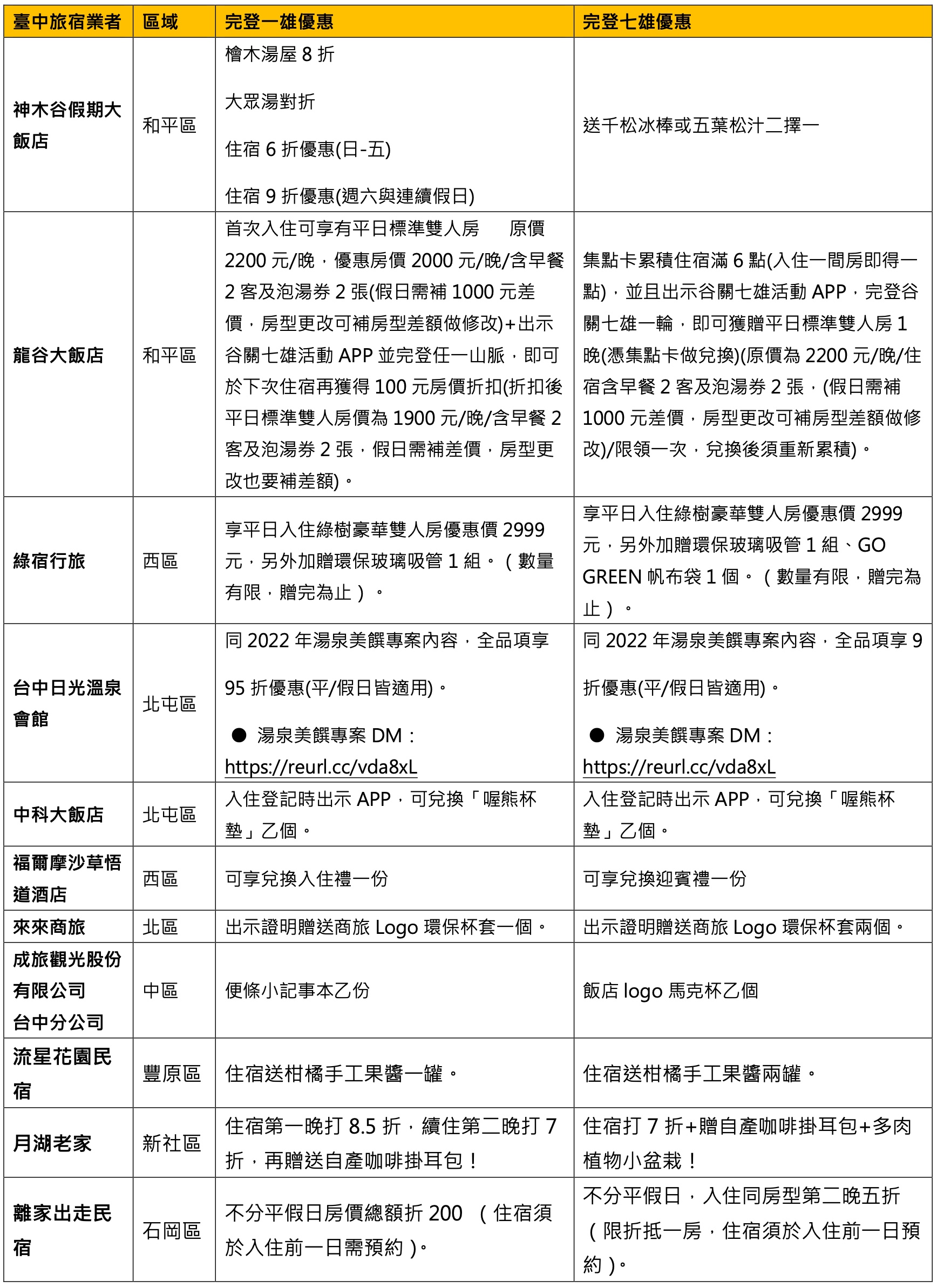 6月20日至9月30日期間,民眾只要在活動期間內前往日光溫泉、台中港酒店、中科大飯店、余舍行旅、成旅晶贊飯店、綠宿行旅、來來商旅、草悟道酒店及神木谷大飯店入住時,下載大玩台中APP並出示谷關七雄活動頁面,享有限量住宿2,999元優惠(須電洽訂房),除了限量的優惠折扣以外,飯店依照各家提供方案加碼贈送或免費升等等禮遇。此外,持《大玩台中卡》民眾,入住合作店家之安心旅宿(https://www.thotel.org/news/1/1),享當日房價最多85折優惠。