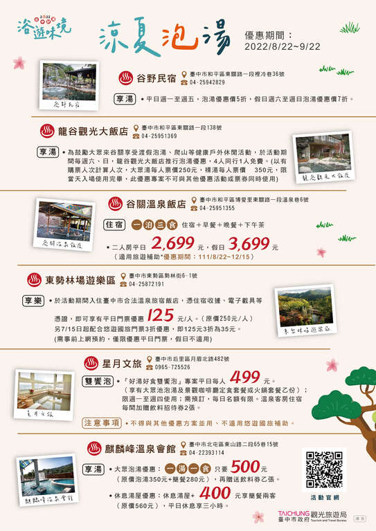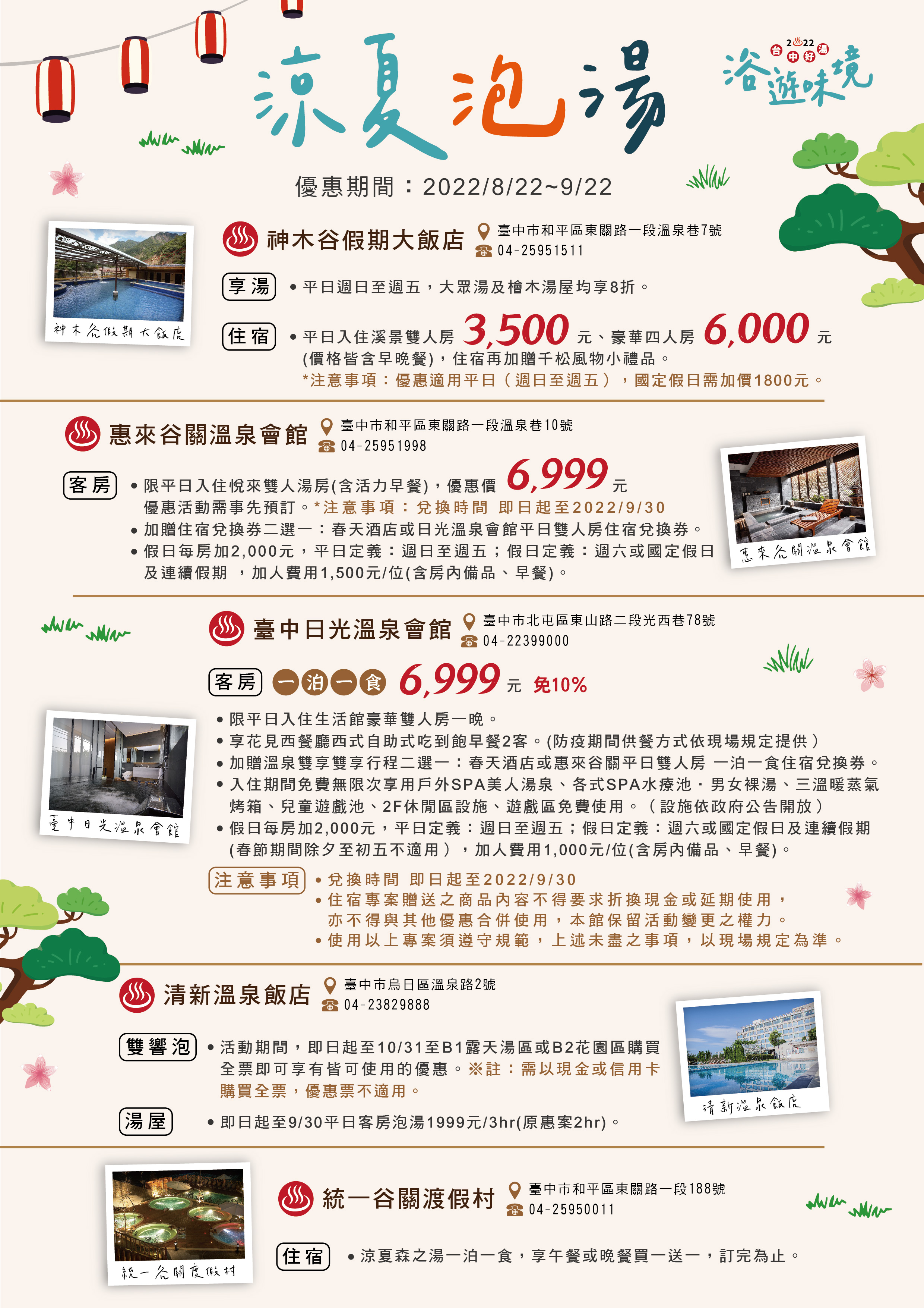 說明| 在溫泉季活動期間,聯合臺中溫泉旅宿業加碼推出涼夏泡湯優惠方案,優惠詳細內容請逕洽各家業者訂房詢問,依其公告為主。