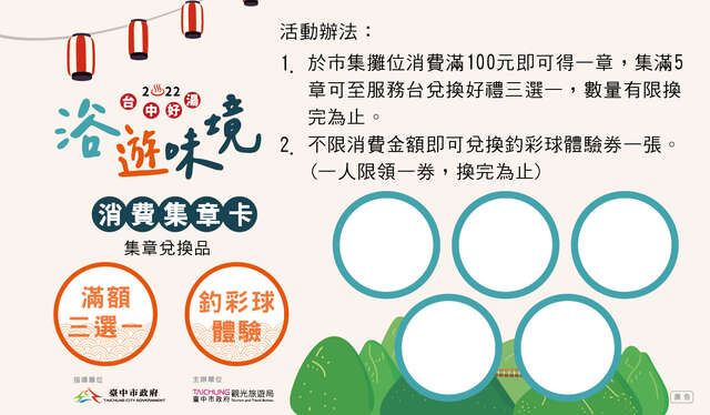 說明|憑活動當日谷關地區消費滿500元之發票(收據)或現場市集攤位集章,即可至服務台兌換〈日式和菓子〉、〈原住民特色DIY體驗〉及〈遊戲機夾好禮〉三選一,數量有限,兌完為止。