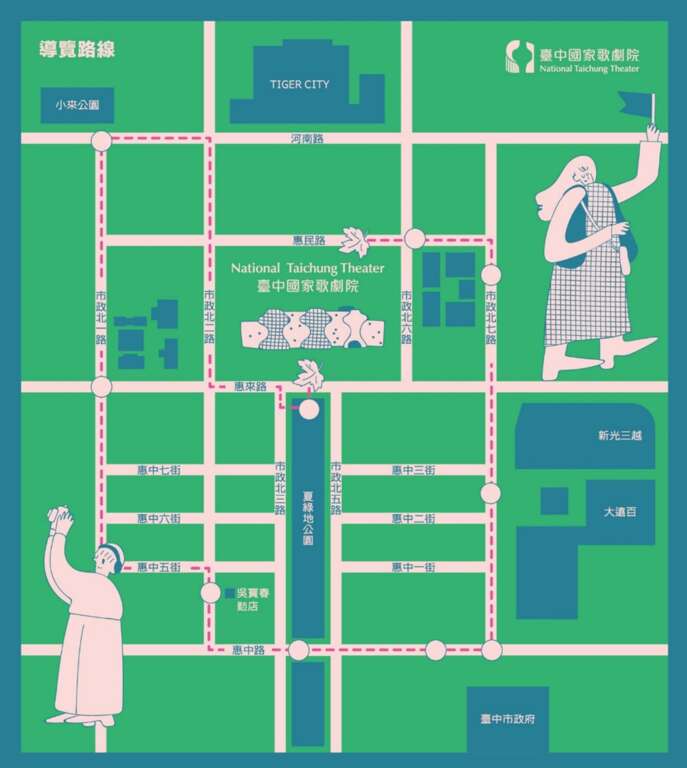 走走路線:臺中國家歌劇院→惠來路→市政北二路→河南路→市政北一路→惠中五街→惠中五街與市政北二路口→惠中路→市政北七路→惠民路→臺中國家歌劇院