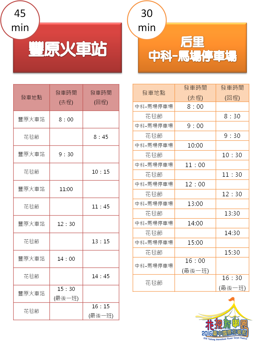 可搭至后里火車站及豐原火車站,轉乘接駁專車。