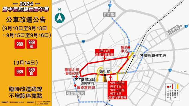 ◆本次活動首次在豐原封街舉行,影響期間自9月10日起至9月16日止,敬請用路人留意。9月10日上午6時至9月16日下午5時止,豐原火車站西側出口前方中正路段禁止汽機車進入及通行,西側出口前計程車停靠站移至車站東側出口東仁街臨時排班處,民眾如有接送臨停需求,亦請避開上述管制路段,改於三民路22號前避車彎或東側豐勢路一段147巷臨停,或是利用豐原轉運中心及社會住宅平面停車場30分鐘內臨停免費服務;9月14日中午12時至下午7時止,中正路沿線(中正路211巷至豐原火車站西側出口前)將有舞蹈踩街展演,禁止汽機車進入及通行。
