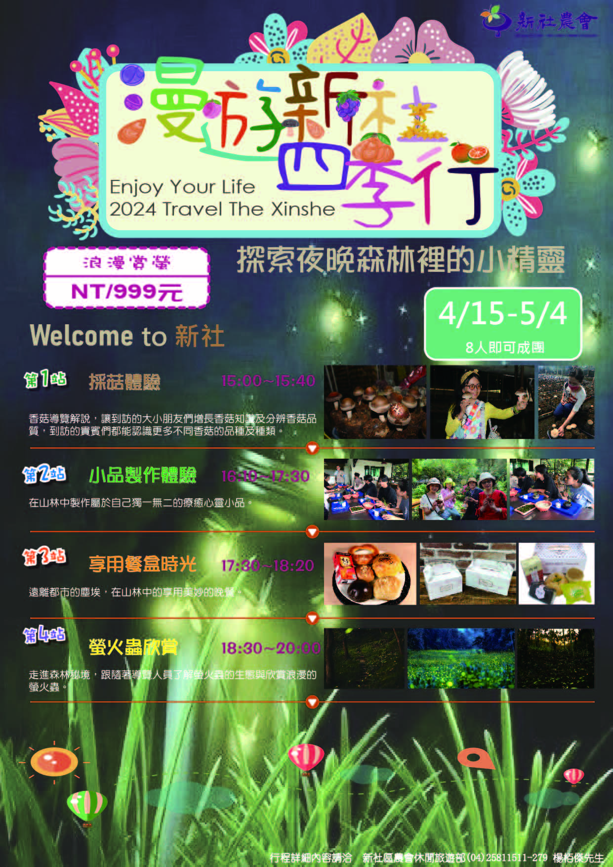 活動月份:2024-04-15~2024-05-04 加入Google行事曆 活動內容活動地點:抽藤坑休閒農業區、馬力埔休閒農業區 活動遊程:採菇體驗→小品製作體驗→享用餐盒時光→螢火蟲欣賞 活動價格:$999元 活動詳情可電話洽詢新社區農會 楊先生04-25811511#279 相關照片