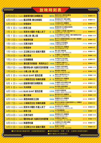 活動月份:2024-06-28~2024-08-31 加入Google行事曆 活動內容「臺中電影Fun-In季」自2011年起經過長期在地深耕,已成為市民朋友們期待的暑期休閒娛樂之一,今年將於6/28-8/31重磅登場!連續十週巡迴臺中29個行政區,場場免費、場場抽獎,開閉幕更有驚喜加碼抽。 附件檔案 2024放映季場次表(.pdf) 相關連結 活動官網 相關照片
