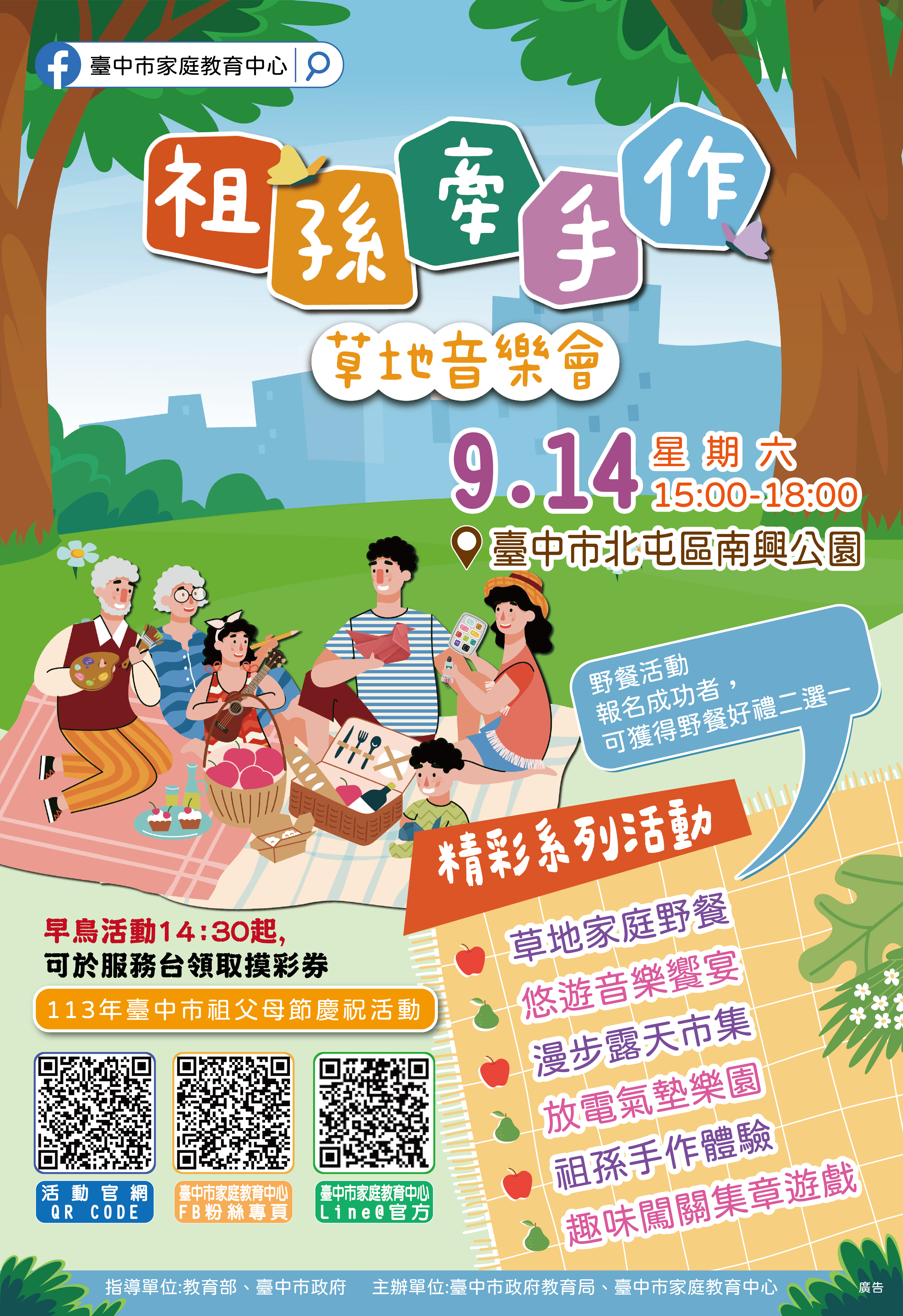 (三) 內容:以代間教育為主題,規劃闖關活動、表演節目、設攤宣導、草地音樂會、家族野餐、手作DIY等活動。