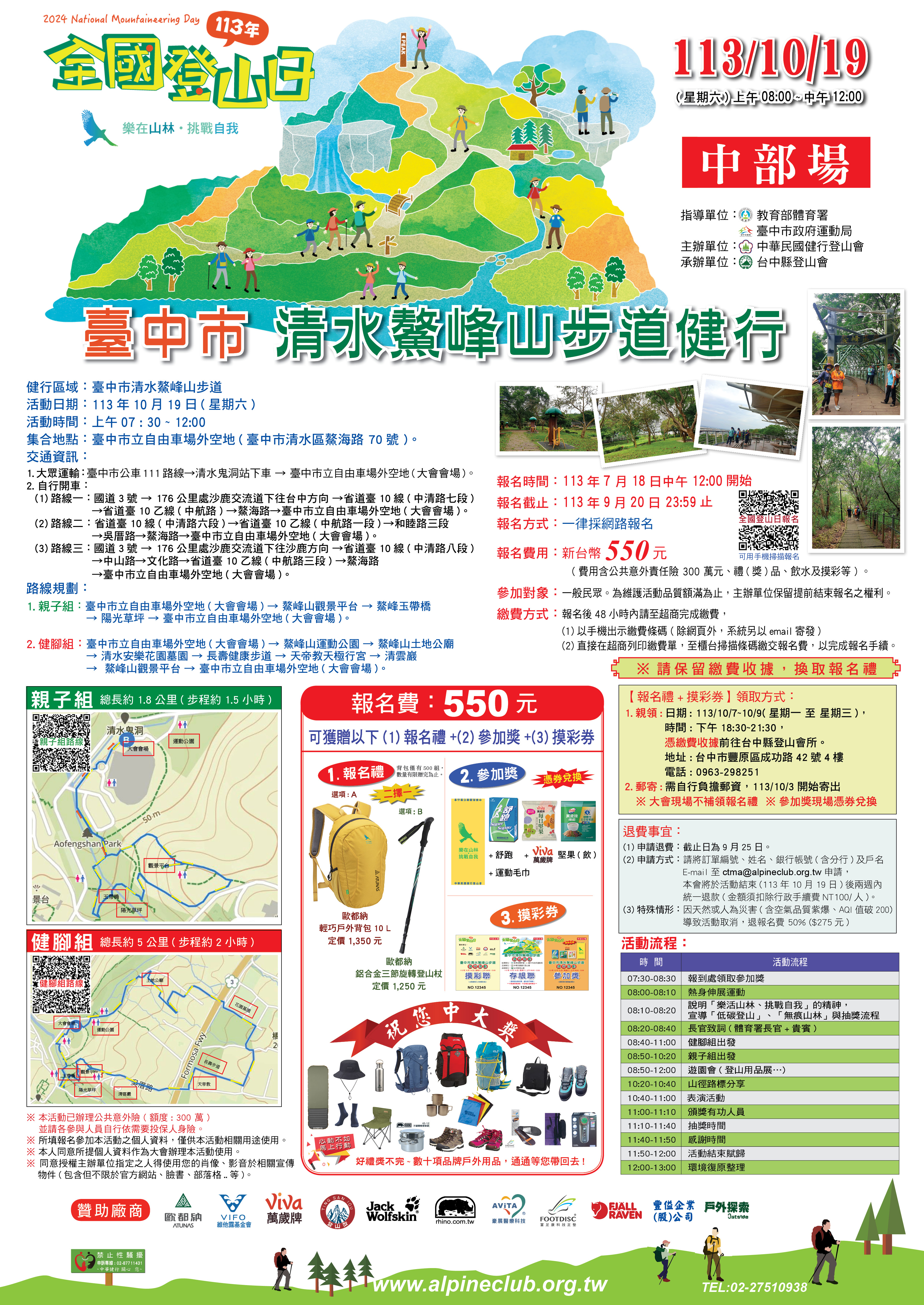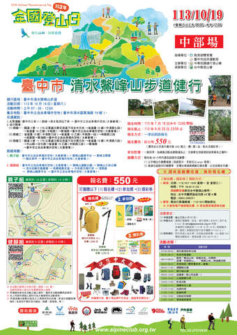 | 活動路線: | 親子組:臺中市立自由車場外空地(大會會場) → 鰲峰山觀景平台 → 鰲峰玉帶橋 → 陽光草坪 → 臺中市立自由車場外空地(大會會場)。 健腳組:臺中市立自由車場外空地(大會會場) → 鰲峰山運動公園 → 鰲峰山土地公廟 → 清水安樂花園墓園 → 長壽健康步道 → 天帝教天極行宮 → 清雲巖 → 鰲峰山觀景平台 → 臺中市立自由車場外空地(大會會場)。 |