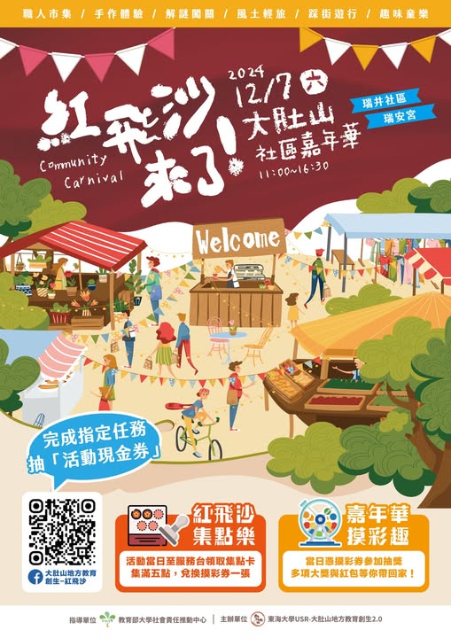 由東海大學社會責任實踐計畫(USR)成立的大肚山地方教育創生團隊,於12月7日在大肚區瑞安宮廣場熱鬧舉辦「大肚山社區嘉年華–紅飛沙來了」活動,推出職人市集、手作體驗、解謎闖關、風土輕旅、踩街遊行與趣味童樂,內容豐富多元,無論親子同遊還是好友相聚,都能找到屬於自己的幸福歡樂時光。