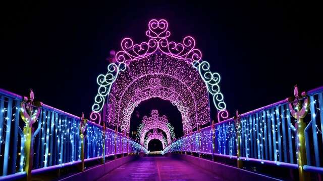 2024石岡花漾藝術燈節展期橫跨元旦、春節假期及元宵節,共61天,今年以愛情浪漫音樂主題點亮0蛋月台、綠六廣場、東豐綠廊、鵲橋、石農咖啡廣場、情人木橋及食水嵙溪休閒農園等,結合特色地景打造絕美燈飾。