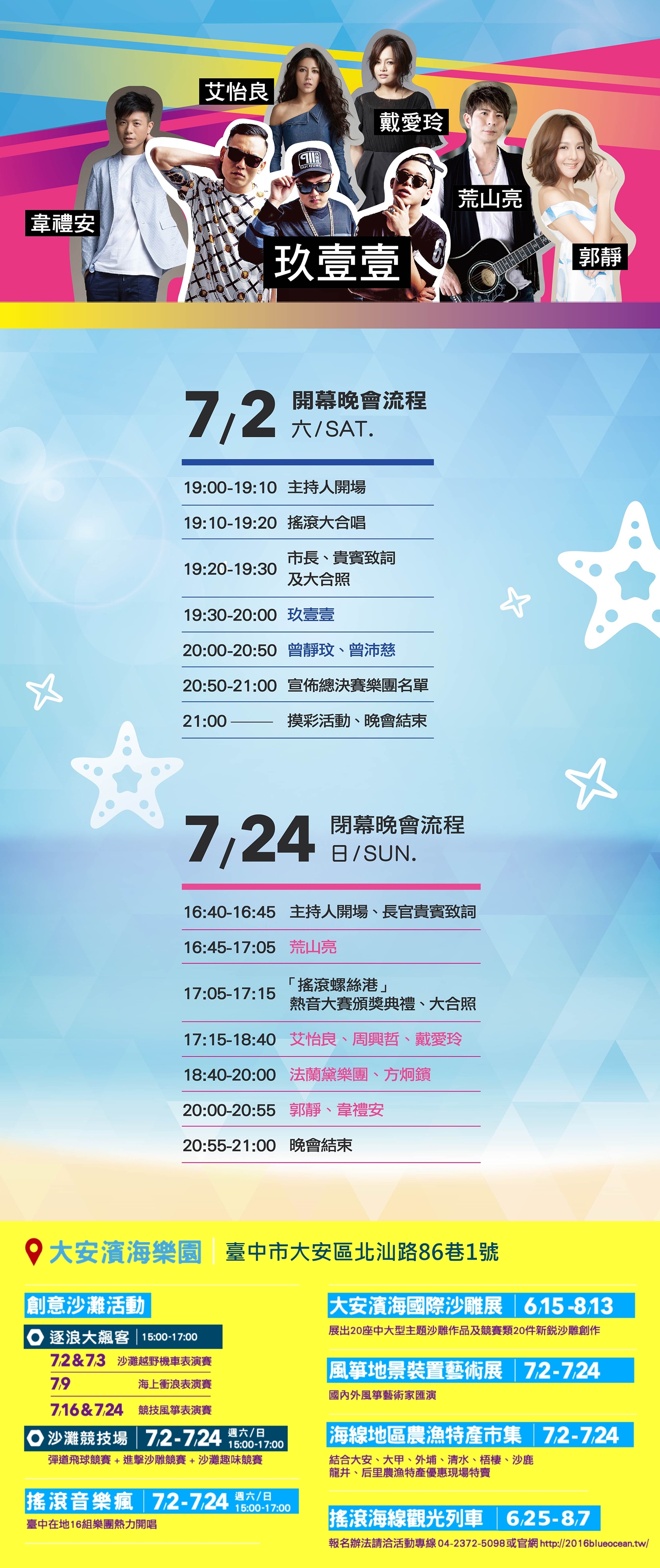每年夏天,中部最精彩的海洋觀光盛事-「2016臺中藍帶海洋觀光季」將於6月15日至8月13日在大安濱海樂園熱鬧舉行,7月2日將舉行盛大開幕晚會,現場將邀請玖壹壹、one band 、曾靜玟及曾沛慈輪番上陣,現場還有沙雕藝術展覽,打造20座中大型沙雕,而整個7月四週的週六、日週週有亮點,推出「創意沙灘活動 」、「大安濱海國際沙雕展 」、「風箏地景裝置藝術展 」、「海線地區農漁特產市集」、「搖滾海線觀光列車」,及「搖滾音樂瘋」等六大主題系列活動,加上每週都有沙灘競技比賽及搖滾音樂表演,活動多元精彩。歡迎全國民眾到海線度過一個歡樂搖滾的音樂沙灘派對!