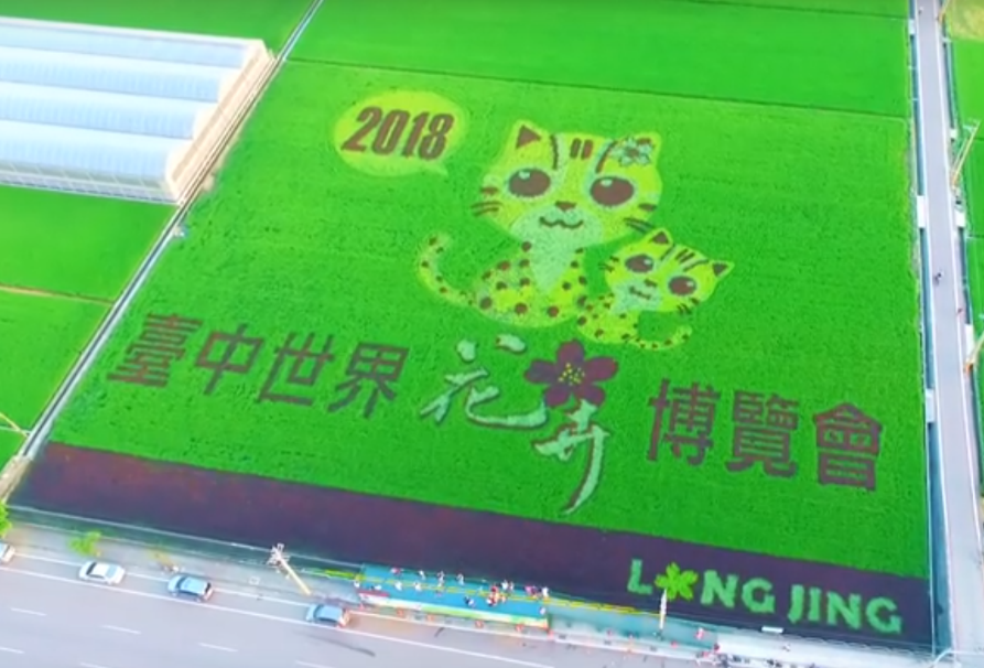 為2018年臺中世界花卉博覽會暖身,臺中市政府農業局及龍井區農會合作設置彩繪稻田1.2公頃,以花博吉祥物「石虎」及市花「山櫻花」為構圖,運用白、綠、黃及紫等4種顏色稻秧編織成彩繪圖騰,種出了兩隻眼睛水汪汪、可愛模樣的大小石虎,吸引了不少遊客前來拍照打卡。