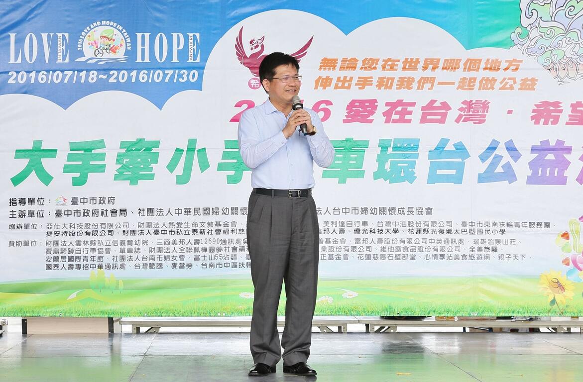 2016「愛在台灣‧希望無限」-大手牽小手單車環台公益活動今(18)早在台灣大道市政大樓廣場舉行啟航儀式,由13名弱勢學童及結合來自美國、馬來西亞及台灣6名國內外志工騎士共19人,展開為期13天的環台旅程,一同為弱勢學童發聲,也希望號召更多人投入關懷在地弱勢家庭學童的行列。市長林佳龍前往加油打氣時,肯定這不僅是一項運動,更結合弱勢關懷並串聯台灣美麗景點,深具意義,預祝旅程圓滿成功。