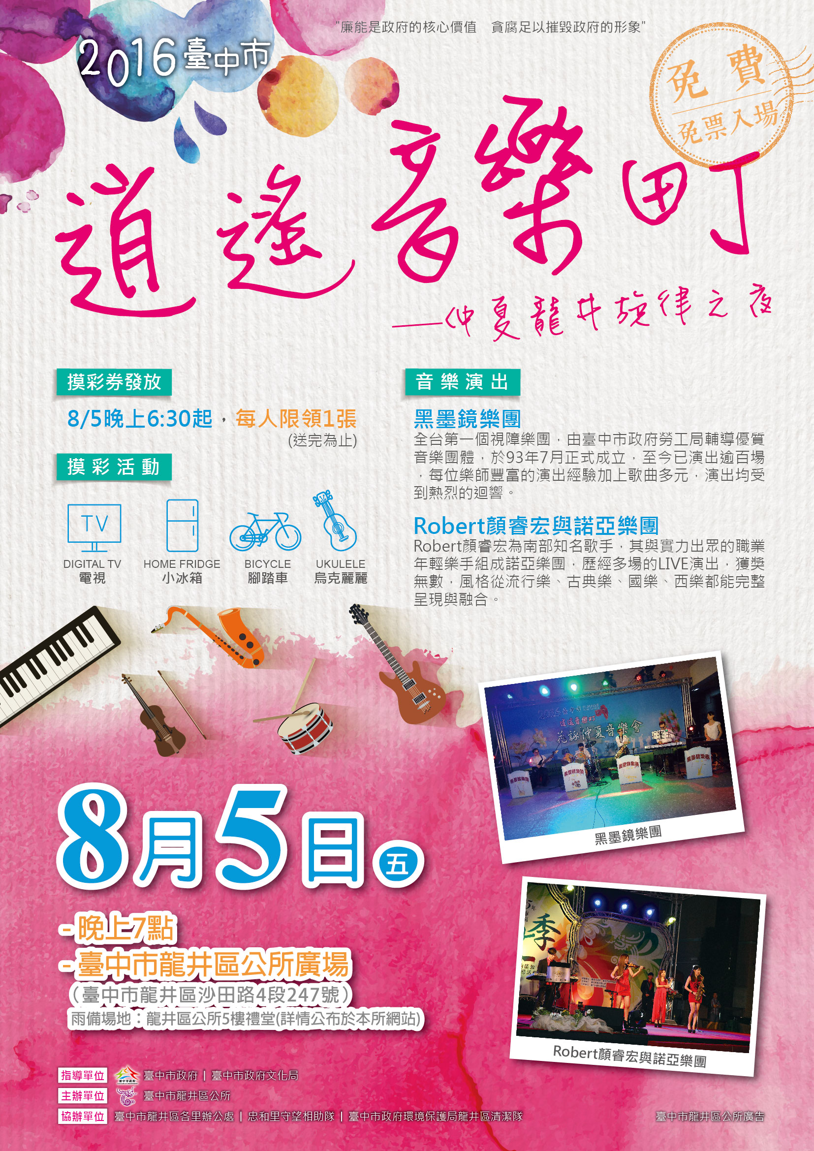 8月5日(五)晚上7:00在龍井區公所前廣場舉辦「2016臺中市逍遙音樂町—仲夏龍井旋律之夜」,邀請黑墨鏡樂團、街頭藝人Robert顏睿宏所帶領的諾亞樂團精采音樂表演,更有多項好禮摸彩活動要送給大家!