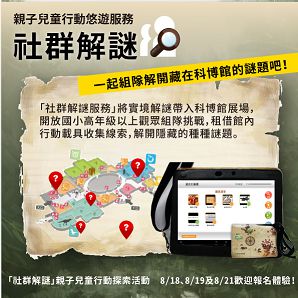 探索科學的方式屢屢創新!今年暑假科博館融合科技與實體展場,推出「社群解謎親子兒童行動探索活動」,以時下風行的實境解謎遊戲,讓團隊透過的情境解謎,促進博物館互動學習。對象為10歲以上兒童與成人觀眾,因破解謎題需整合資訊和一定的邏輯思考能力,建議12歲以下兒童以親子組隊方式參加,詳情參考。