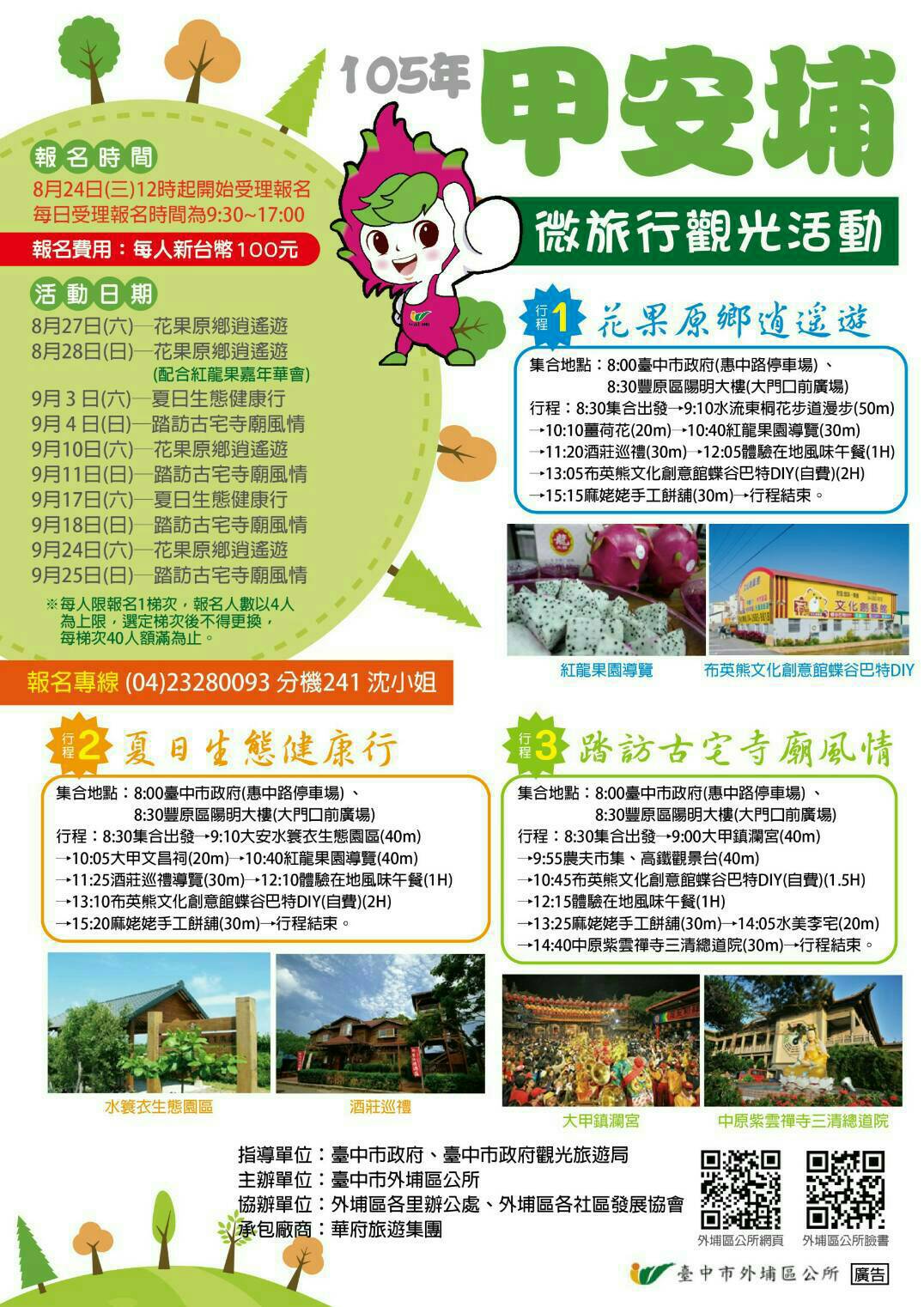 為行銷臺中市優質紅龍果,外埔區公所在臺中市政府農業局經費支持下訂於8月28日假臺中市外埔區永豐社區活動中心旁廣場辦理「105年度外埔區紅龍果嘉年華」活動,今年以多元化且精彩的活動,帶領民眾了解外埔豐富的農業、人文與觀光,歡迎民眾前來體驗外埔紅龍果風情。