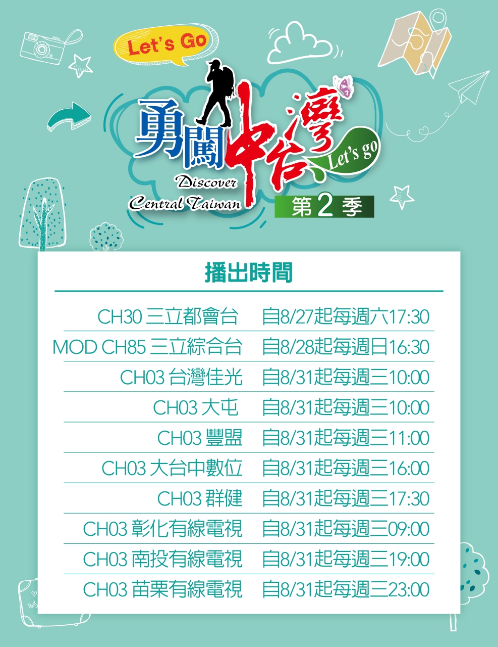 2016年全新一季的「勇闖中台灣第二季」開播了,節目內容上也獨家收錄了中台灣的人氣新地標、文創基地、節慶活動、特色美食…等,使節目內容更加豐富多元。