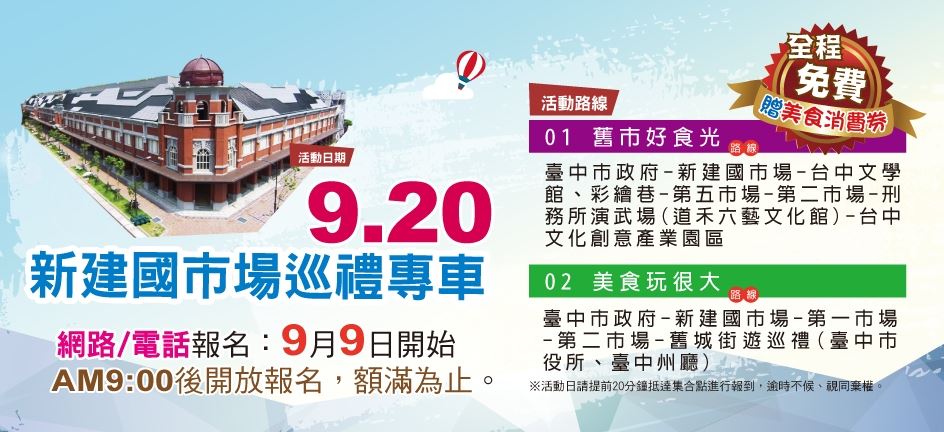 「美食玩很大」專車路線將新建國市場、第一、第二市場、台中市役所、台中州廳,活動全程免費,參加還能拿市場美食券,填寫問卷可得到市場嘉年華活動摸彩券一張,摸彩活動將於今年底前辦理。