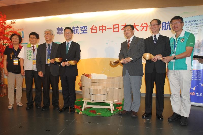 台中市政府與華信航空共同開闢台中-日本大分定期航班,每周四、日共飛航兩班次,今(15)日一早於台中清泉崗國際機場進行首航儀式,市府副秘書長郭坤明也與158名遊客,一起搭乘「花現台中」彩繪機飛往有「日本第一溫泉縣」美稱的大分縣,並盼兩地藉此展開全面性的交流。