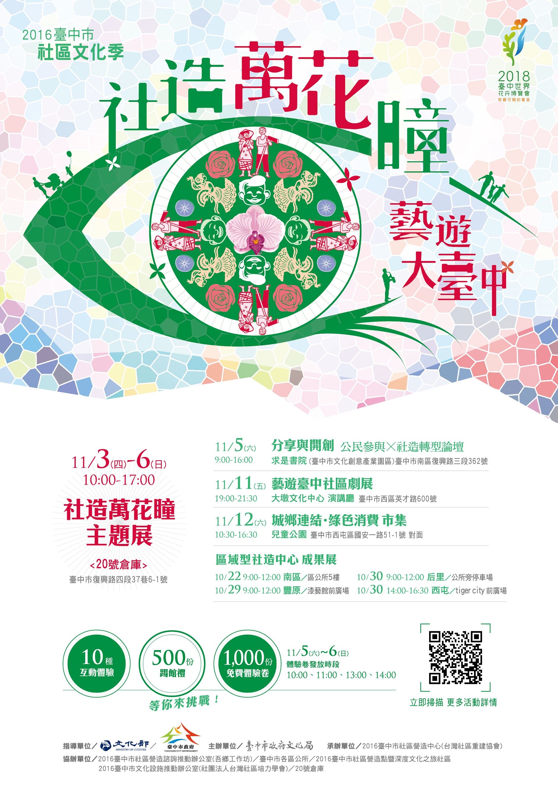 臺中市政府文化局為推動本市社區營造業務,強化社造資源整合與行銷本市區域品牌,鼓勵本市各區公所、社造點及地方文化館展示其執行計畫實績,辦理「2016臺中市社區文化季─社造萬花瞳,藝遊大臺中」活動