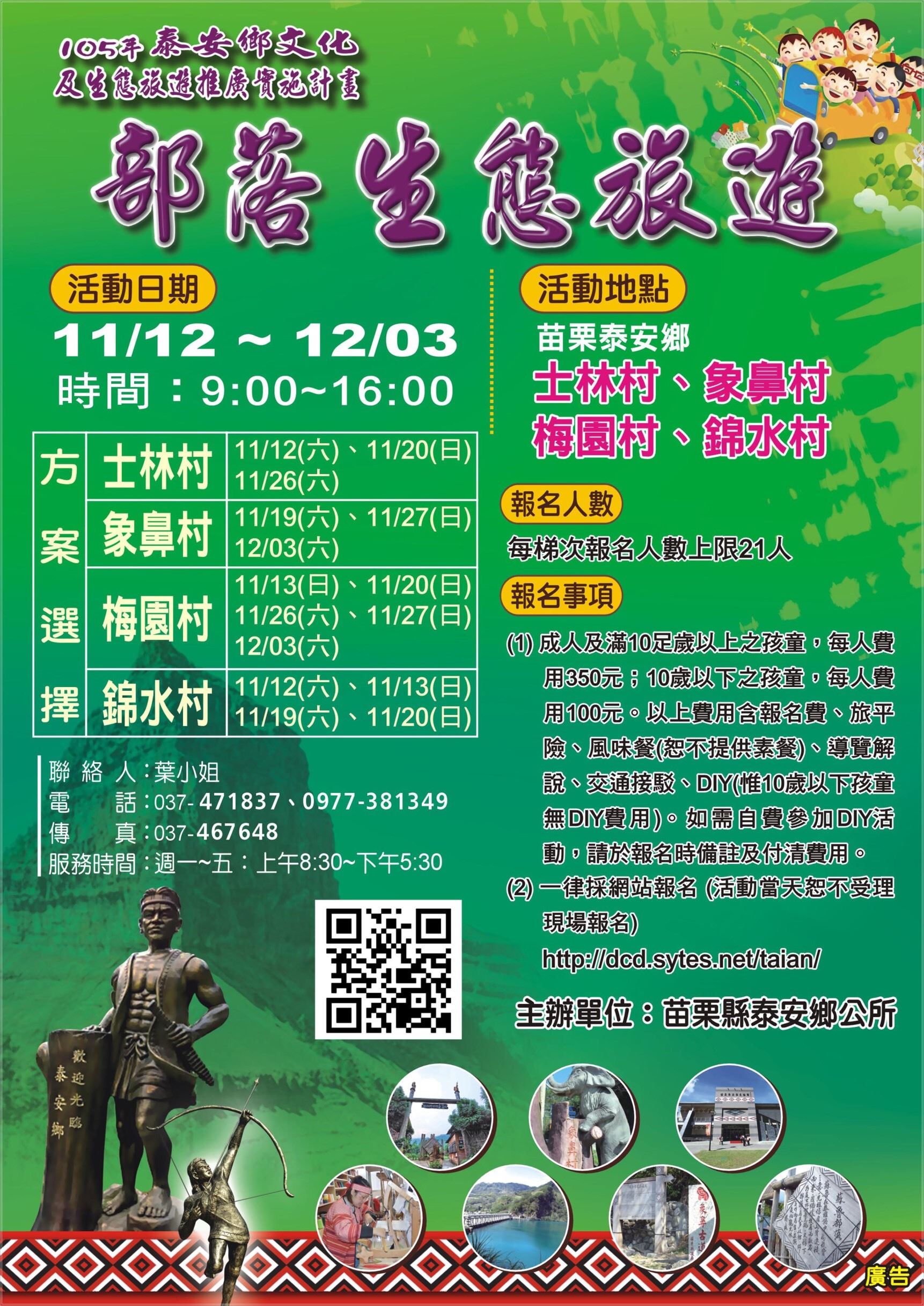 (二)活動內容豐富,名額有限,歡迎各界踴躍參加,一律採網路報名,網址:http://www.taian.gov.tw/,或搜尋泰安鄉公所網站報名。