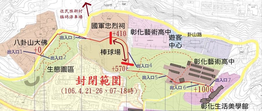 一、本縣八卦山天空步道因配合106年全國中等學校運動會於八卦山棒球場舉辦「射箭」比賽,基於安全考量,將於106年4月21日(星期五)至4月26日(星期三)每日7至18時封閉部分路段,封閉範圍為步道里程「0+410公尺至0+570公尺」間之區域(詳如附圖),現場將設置管制設施,禁止通行,至於天空步道其它路段仍正常開放。