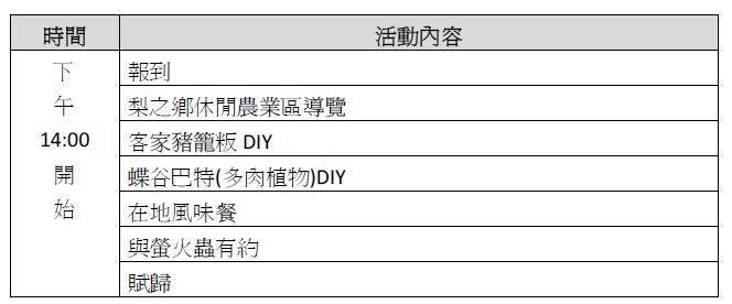 - 活動配合店家:山水雲生態農場、心有林畦、月亮小木屋、擁葉生態休閒農場。