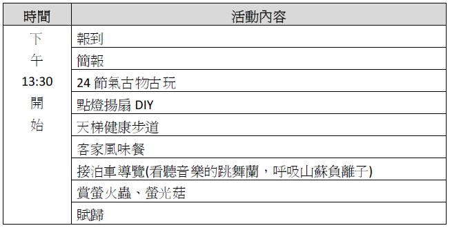 - 含賞螢前生態保護教育與賞螢火蟲安全課程。