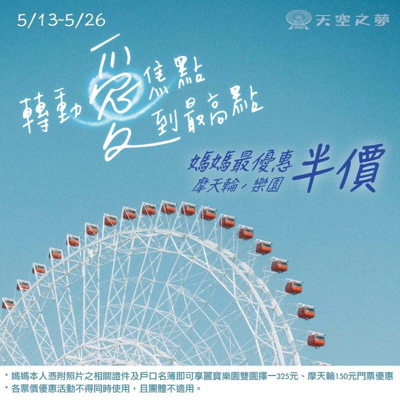 適逢母親節前夕,園方也把摩天輪首次優惠獻給最辛苦的媽媽們,5/13至5/26止,媽媽憑身分證件+戶口名簿搭摩天輪,一律只要半價150元(原價全票平日300元、假日350元),玩樂園也同樣半價優惠(原價650元);持玉山麗寶悠遊聯名卡,刷卡購買摩天輪全票,每張可折抵50元,每日每卡限購4張,優惠期限至2017年底。