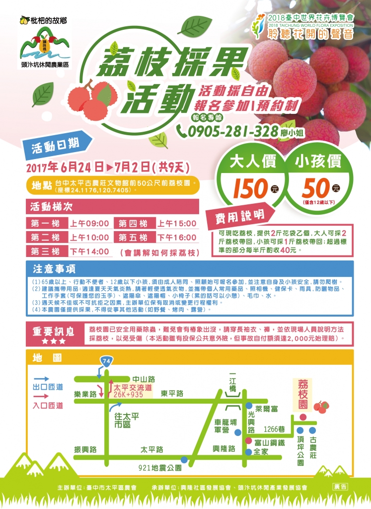 夏天是荔枝盛產的季節,也是體驗「採荔枝」最好時節;太平頭汴坑休閒農業區與太平農會、興隆社區發展協會結合當地荔枝農共同推出一系列荔枝體驗活動,邀請民眾來體驗農業之旅!
