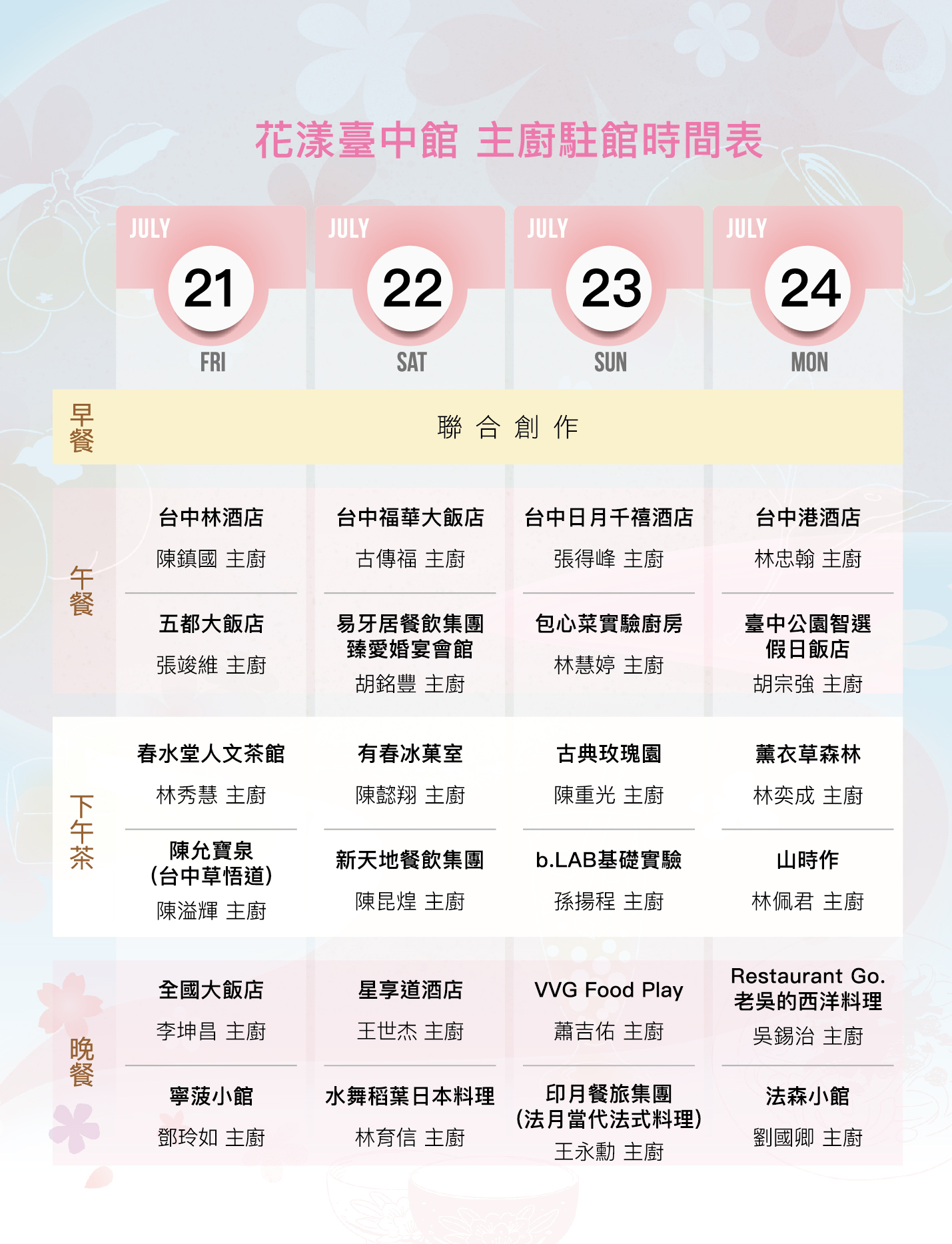 觀旅局陳局長表示,台灣美食展從去年開始結合花卉元素,規劃以三部曲的方式為花博盛會暖身,今年「花漾台中館」將於21至24日在台北世貿展覽館一館展出,共24位主廚展現台中美食生活,而明年也預計擴大邀請更多主廚共同參與,邀請大家一起透過美食迎接花博盛會。